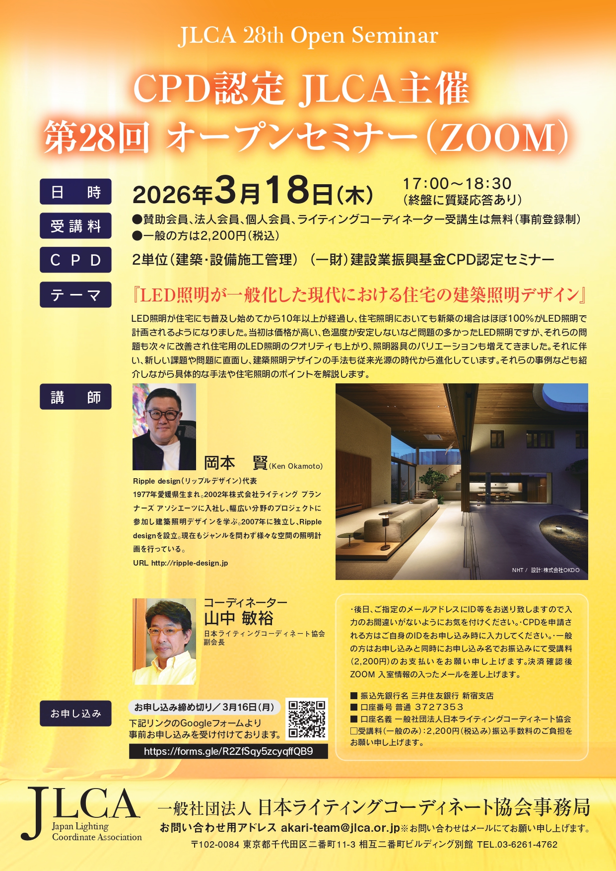 第28回オープンセミナー(ZOOM)「LED照明が一般化した現代における住宅の建築照明デザイン」