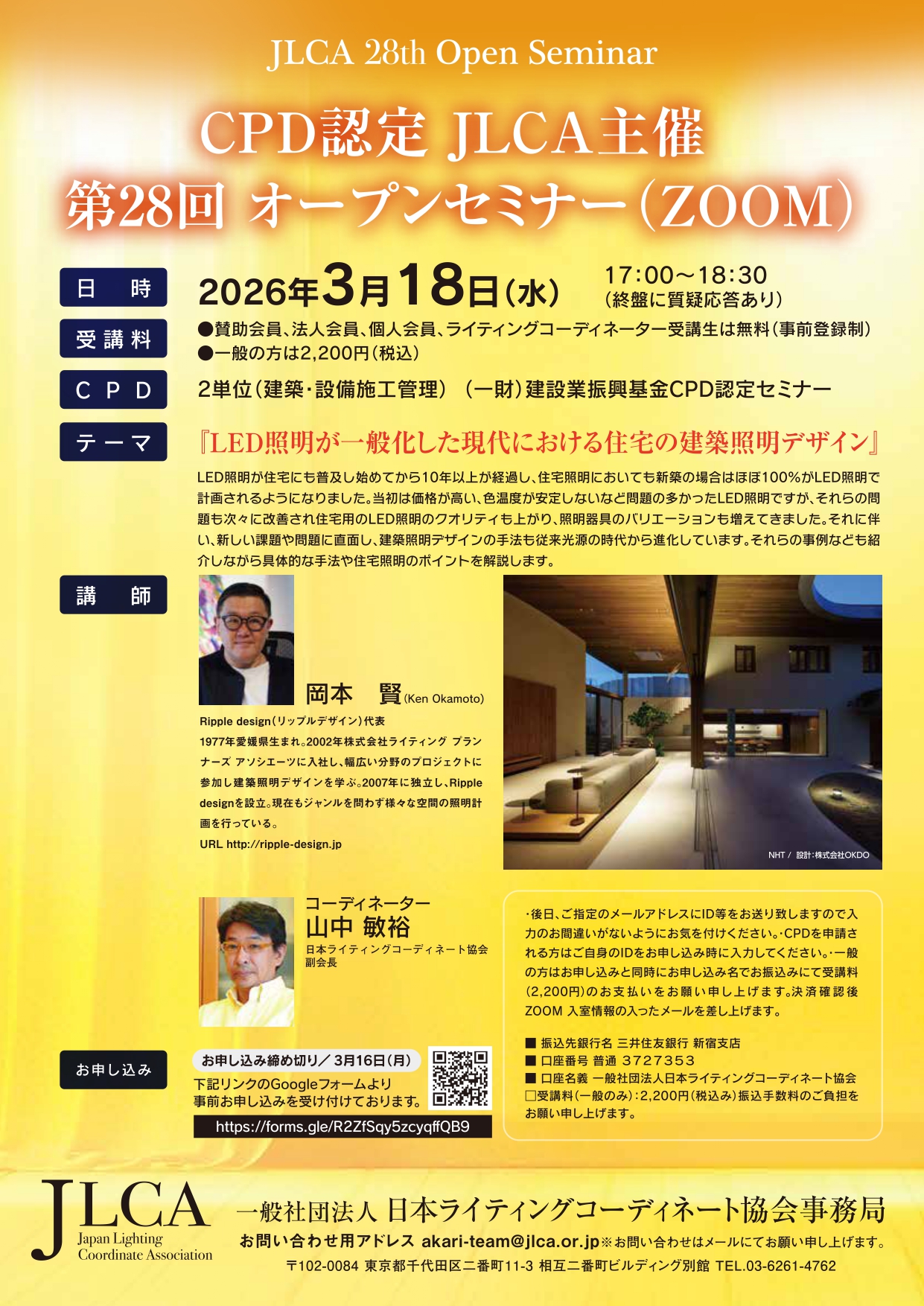 第28回オープンセミナー(ZOOM)「LED照明が一般化した現代における住宅の建築照明デザイン」 プロの照明デザイナーに聞くシリーズ③